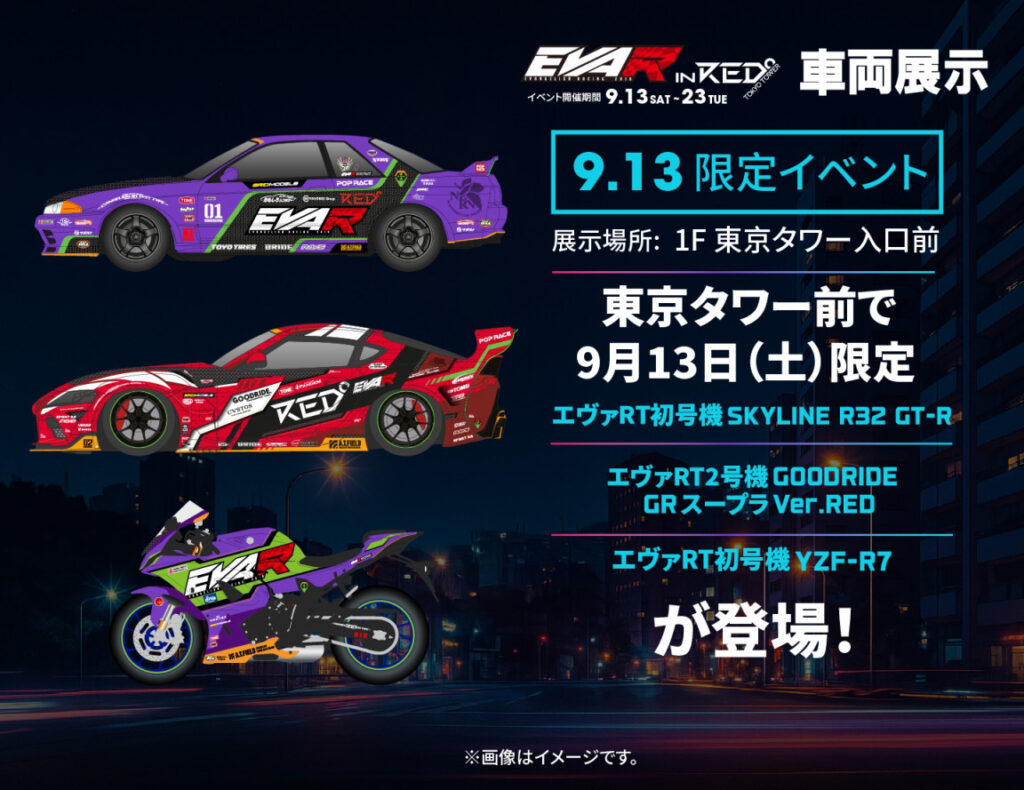 2025年9月13日に東京タワーに展示されるエヴァRT2号機GOODRIDE GRスープラVer.REDのプロモーションムービーを制作しました [イベント詳細] 東京タワー前にエヴァンゲリオンレーシングの展示車両が登場!RED° TOKYO TOWERとの限定コラボグッズやコラボドリンクも! 本イベントで初公開となるエヴァRT初号機スカイラインR32 RT-Rがに加え、昨年初号機カラーでフォーミュラドリフトジャパンの会場を盛り上げたGRスープラが、2号機カラーとなって登場!そして、8月の鈴鹿8耐でお披露目となったバイク、エヴァRT初号機YZF-R7も加わり、計3台のエヴァカラーのマシンが9/13日(土)限定で、東京タワーに集結します。